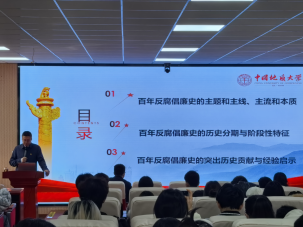 “一切向前走,都不能忘记走过的路;走得再远、走到再光辉的未来,也不能忘记走过的过去,不能忘记为什么出发。”党课开篇,徐岩书记便以这句深刻论述为引,围绕百年反腐倡廉史的主题主线、历史分期与阶段性特征、历史贡献与经验启示三大核心内容展开系统讲解。徐岩书记强调,百年反腐倡廉史的核心主题与主线是防止党腐化变质,保持党的先进性和纯洁性,本质是一部持续推进的廉政治理探索史。他紧扣党史脉络和典型案例,梳理了党内专责监督机关的演变轨迹、党内法规的发展历程与廉政治理的实践探索,生动呈现了党自诞生之初就秉持的从严要求与自我革命精神,深刻剖析了反腐倡廉工作在各个历史时期的阶段性特征。他指出党的百年反腐倡廉史,在探索中走出一条立足于社会主义初级阶段基本国情的中国特色反腐倡廉道路;聚焦百年党史中的廉政建设,从中总结出坚持党的领导、牢记初心使命、提高政治站位、站稳人民立场、创新体制机制、打造过硬队伍、设定理性目标、保持足够自信八个方面的经验启示。党课最后,他寄语青年学生,要从历史积淀中汲取奋进力量,在学习、生活与工作中时刻绷紧廉洁自律之弦、守牢思想防线、永葆清正廉洁作风。